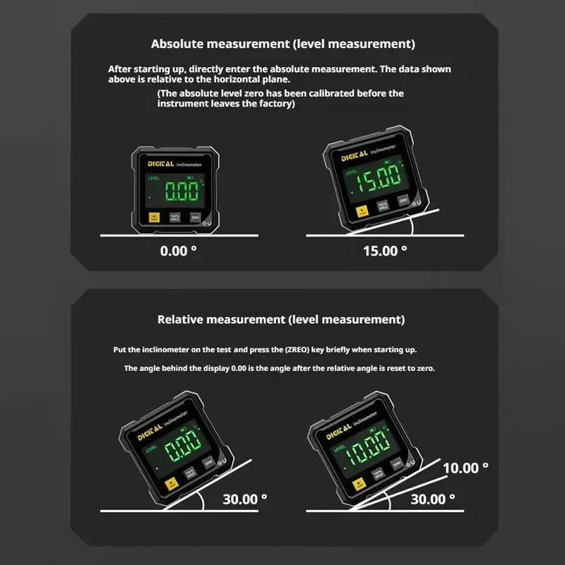 Digital inclinometer, 360 precise measurement + laser marking lines, the king of industrial-grade angle detection function. This digital inclinometer reshapes the angle detection experience with a full-function matrix! It is equipped with a high-precision digital display system, with readings accurate to 0.01 . 360 measurement of any angle has no blind spots. Whether it is the horizontal calibration of equipment installation or the angle control in mechanical processing, it can present precise data in real time.