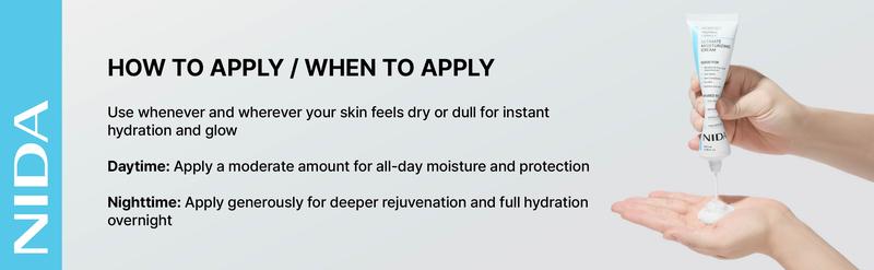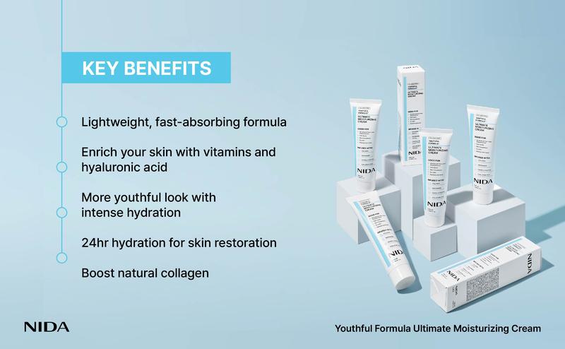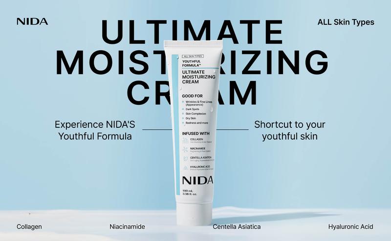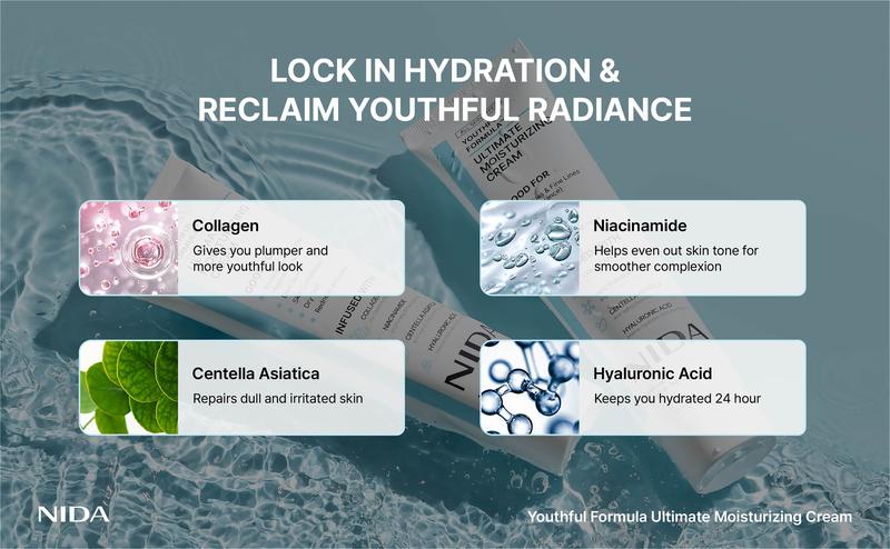 Experience hydrated, healthy-looking skin with NIDA Youthful Formula Ultimate Moisturizing Cream. This cream features a blend of ingredients, including Collagen, Niacinamide, Centella Asiatica, Hyaluronic Acid, and Bifida, selected to help moisturize, soothe, and support the appearance of your skin.